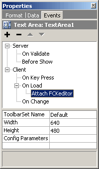 The options shown in the dialog are same as in the Attach FCKeditor action, which is automatically added the On Load client event of the TextArea control created at the same time. Selecting this action exposes FCKeditor parameters configured via the above dialog where you can further modify them as needed. As you may suspect, you could also add FCKeditor to your page by manually attaching the Attach FCKeditor action to the On Load client event of an existing TextArea and configuring it.