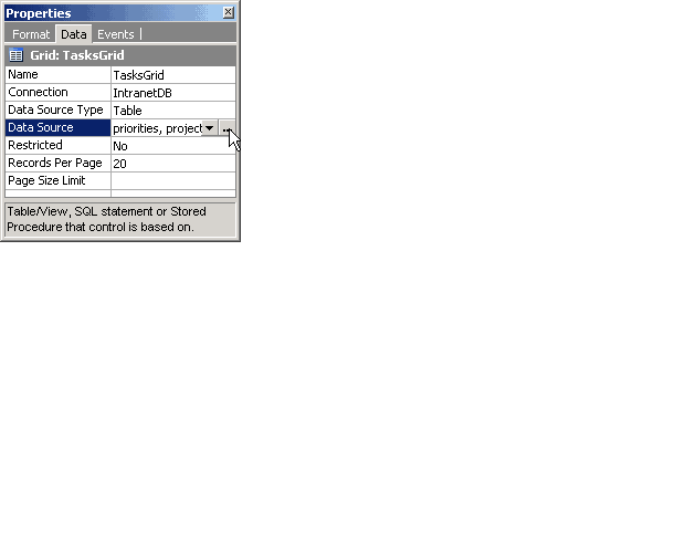 Note that a record or editable grid form can still have its Data Source property configured to use an ordinary table and yet have procedures for the insert, update and delete operations. This is because the Data Source property is different from the six properties mentioned above. Essentially, the Data Source property determines the means by which data will be retrieved to appear in the form while the other six properties mentioned above determine the means by which the data is manipulated depending on the operation (Insert, Update, Delete).