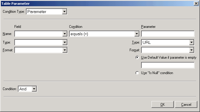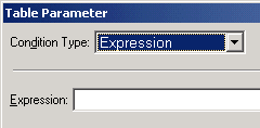 When the Condition Type field in the Table Parameter window is set to Expression the options in the window are different compared to when the Condition Type is set to Parameter.