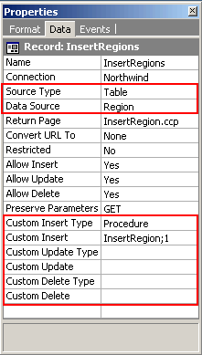 If, for example, you want to use a stored procedure to insert records you would set the Custom Insert Type property to Procedure then use the Custom Insert property to configure the procedure in a similar manner as was done using the Data Source property. Similarly, the other four properties can be used to configure stored procedures to update and delete records respectively.