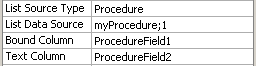 Stored procedures can also be used to populate ListBox and Radiolist controls. In this case, the List Source Type property is set to Procedure then the List Data Source property is used to configure the stored procedure and its parameters.
