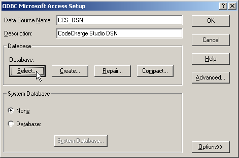 You can create a new ODBC DSN from within CodeCharge Studio or by using the Data Sources ODBC option available in your system's Control Panel or administrative tools. In either case, the steps involved are essentially identical so we will demonstrate how the process is accomplished from within CodeCharge Studio.
