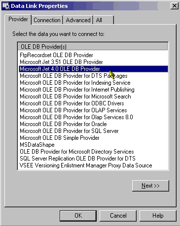 1. The Provider tab is used to specify the database provider/driver to be used. Under this tab will be listed all the database providers currently installed on the machine. Select the appropriate provider for the database you want to connect to then click Next to move to the Connection tab. In the illustration, the Microsoft Jet 4.0 OLE DB Provider has been selected to create a connection string to a Microsoft Access database.