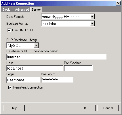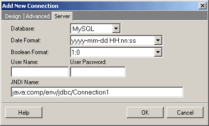 The server connection is the database connection used by the generated pages to retrieve and update data. This connection can be different from the design connection used by the CodeCharge Studio, especially if you are publishing your web application to a remote web server.