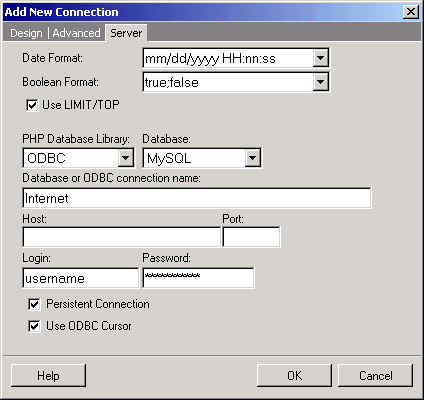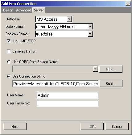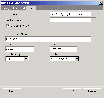 When using the ColdFusion application engine, and language, all server-side connections must be made through an ODBC DSN. The design-time connection used within CodeCharge Studio can be configured using an OLE DB provider or an ODBC DSN but the server-side connection must use an ODBC DSN. The Server tab of the connection properties window is used to configure the ODBC DSN connection.