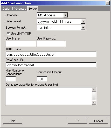 When publishing in JSP or Java Servlets, the server-side connection differs significantly from the other languages. You have to explicitly specify the driver to be used for the connection as well as enter a URL for the connected database.