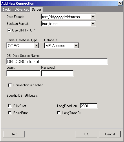 Within CodeCharge Studio, setting up the Server side database connection is pretty straight forward. To begin with, note that the design-time connection does not use the DBI or DBD packages but rather can be configured to connect directly to the database using OLE DB or ODBC. It is only the server-side connection that uses DBI.