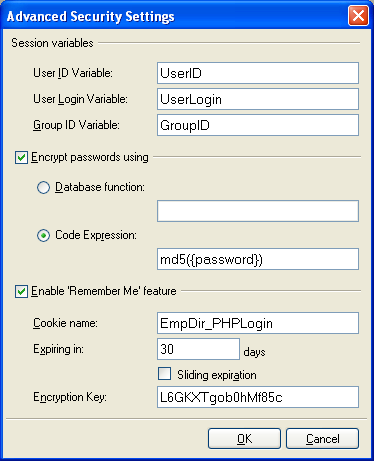 CodeCharge Studio provides two methods of protecting password confidentiality: encrypting passwords using a database function or programming code (code expression).
