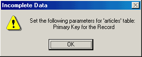 CodeCharge StudioThe following message window appears on Step six (6) of the Application Builder if the database table does not have the Primary Key or ODBC connection is used as a Data Source.