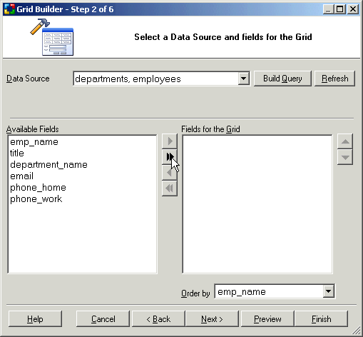 Once finished using the Visual Query Builder, the Grid Builder will display all database fields available for inclusion in the grid.