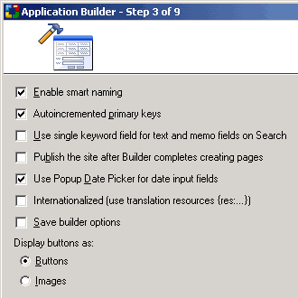 | Enable smart naming | With this option selected, the Builder will generate English like captions for the database table and field names. For example, the grid form for a database table called 'employees' will have a caption 'List of Employees'. Additionally, fields with underscores in them will be converted to column captions without the underscore e.g. 'task_name' will be shown as 'Task Name'. |