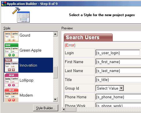 CodeCharge StudioThe Application Builder can be used to create multiple project pages based on the tables or queries in a designated database connection. In some instances, the Application Builder can be used to create all the project pages. The different steps of the Application Builder allow you to create grid, record and search forms for any of the tables within a database connection. Once you've completed the Application Builder steps you can then publish your web pages or edit them within CodeCharge Studio to include custom functionality.