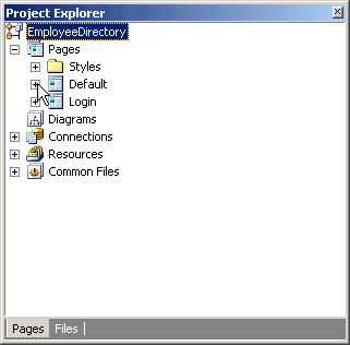 The Project Explorer window works in conjunction with the Document window and the Properties window. Double-clicking on a page within the Project Explorer window will cause it to be opened in the Document window. At the same time, the Properties window displays the various properties for the currently selected component. Using the Project Explorer, you can drill down to the basic elements of a project and execute various commands by right clicking on an element to bring up a popup menu.