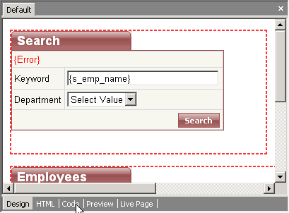 CodeCharge StudioMuch of your time using CodeCharge Studio will involve the document window. The document window serves multiple purposes depending on the mode it is currently set to. The five different modes the document window can be set in are: