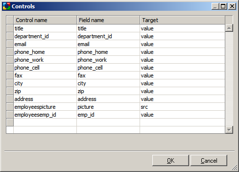 service. You can also specify HTML property as the target for each control if other than "value". For example specify "src" to modify the image source. |