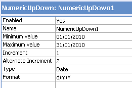 CodeCharge StudioThe NumericUpDown feature is used to change a textbox to a graduating list. An 'up' and 'down' icon is added to the textbox. When the user selects the 'up' arrow, values are automatically displayed and increased in the textbox as the user continues to select the 'up' arrow. The starting value is the 'Mininum value' property defined below. The 'down' arrow does the reverse. The feature can also be applied to show graduating 'date' or 'time' values in a format specified for the feature.